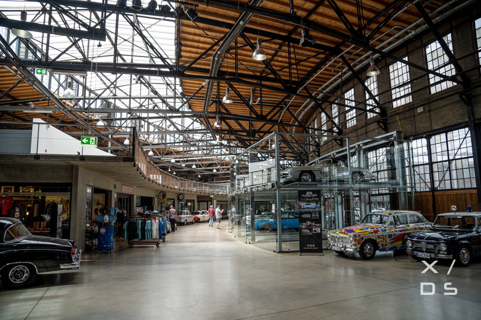 On the way back from Zandwoort to Nürburgring Nordschleife we visited the Classic Remise Düsseldorf in July 2022. This is a center for vintage cars, can be found in a historic roundhouse for locomotives. A railway roundhouse is a building with a circular shape used by railways for servicing and storing locomotives. Traditionally, though not always the case today, these buildings surrounded or were adjacent to a turntable. Locomotives and railway is gone for now — there are garages, services and dealers for classic cars, shops for spare parts, clothing, model cars, accessories and restaurants in this landmark building.